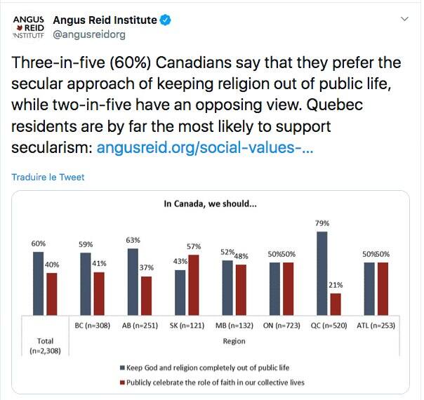 Je les inviterais à consulter ce énième sondage qui pointe dans la même direction que les autres en cette matière, soit celui de la firme Angus Reid, pancanadien, sur les questions «sociales», comme la laïcité (secularism en anglais).