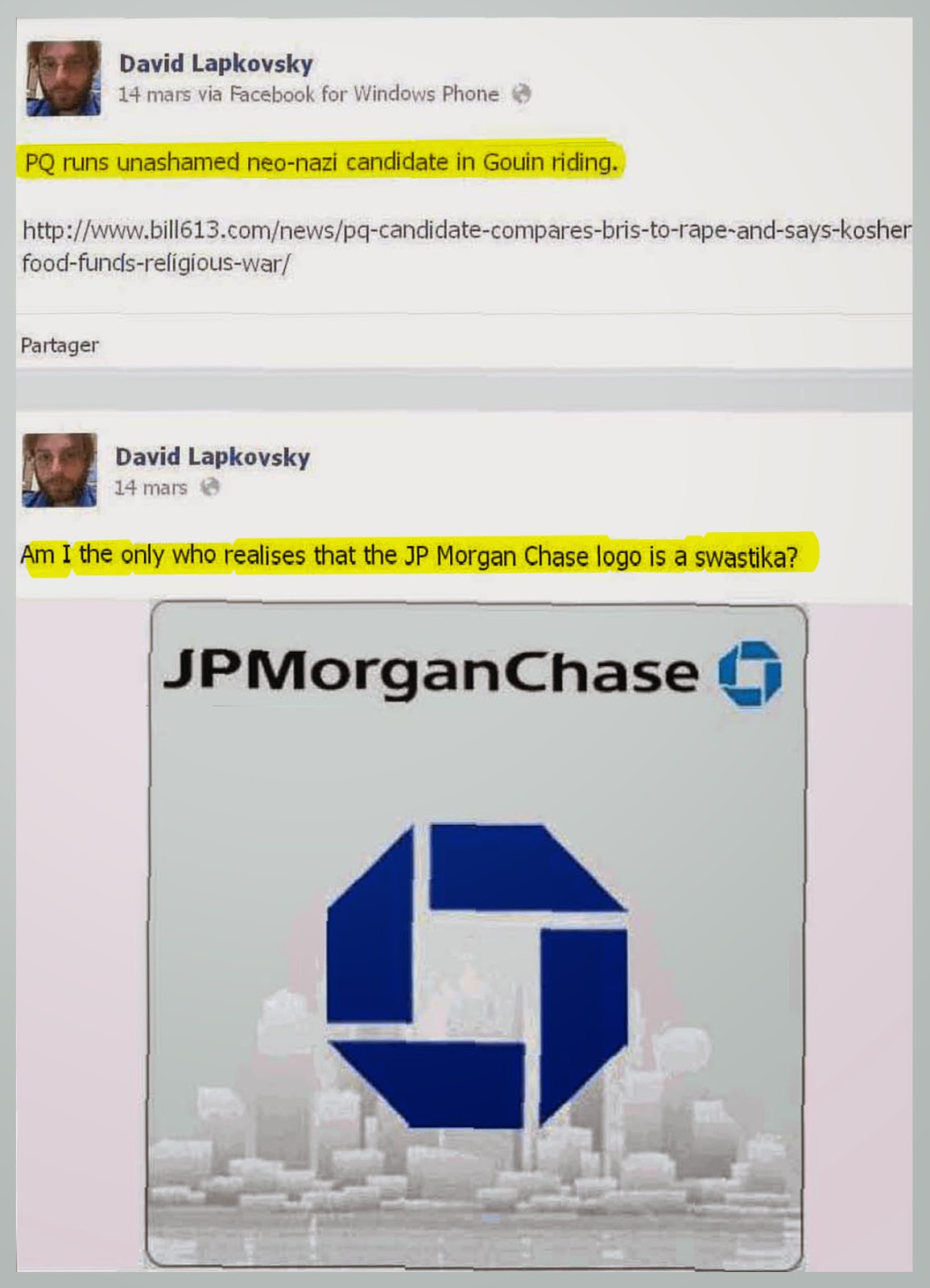 | Certains, comme ce lecteur du site ultraorthodoxe Bill 613, voient des néonazis partout et des svastikas jusque dans le logo de JPMorganChase! |