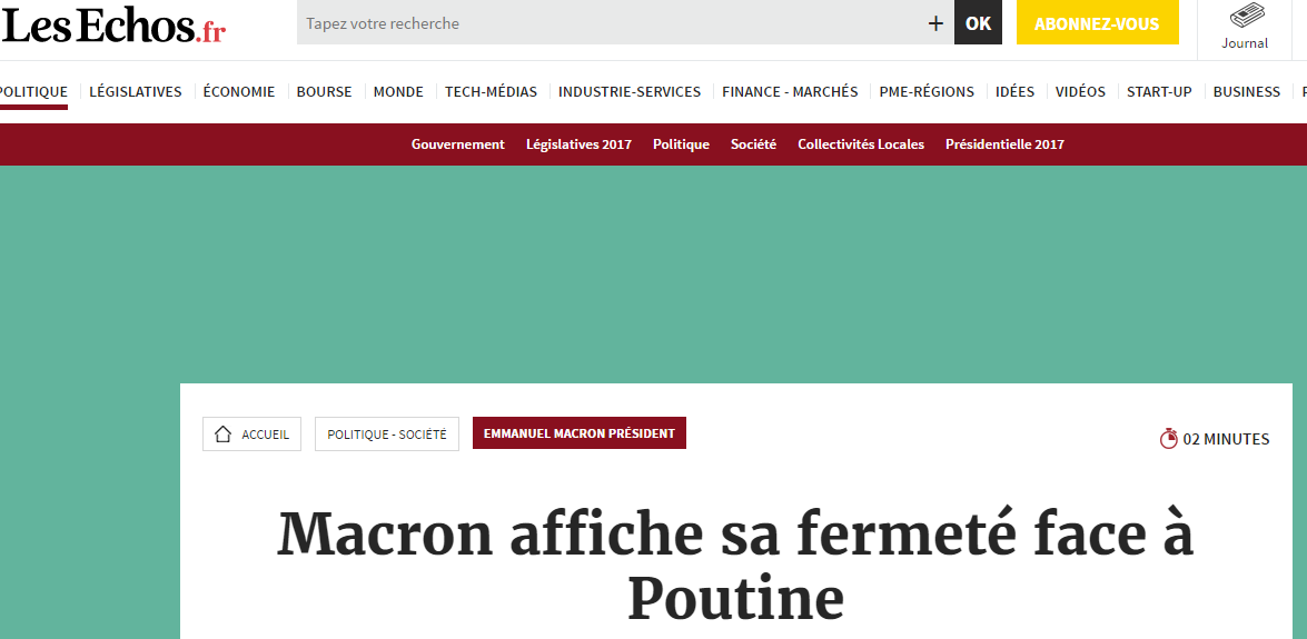 Lorsque deux chefs d'Etat se rencontrent, chacun doit avoir une idée claire de ce qu'il attend de la discussion. Si l'on comprend sans difficulté l'intérêt pour Macron d'inviter le Président russe, l'intérêt de la Russie de se prêter au jeu du faire-valoir est beaucou plus flou. De cette confrontation, semble-t-il inattendue pour la Russie, en ressortira peut-être plus de clairvoyance dans sa vision de la France contemporaine.